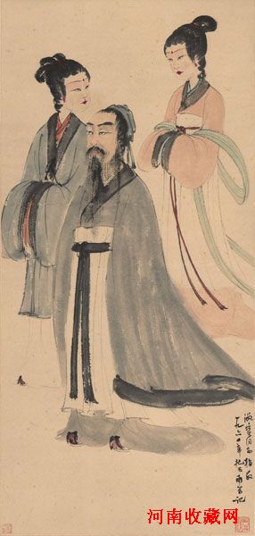 傅抱石的《东山携*图》,为著名美籍华裔私人收藏家邓仕勋先生旧藏。出生于中国广东省的邓仕勋,是闻名世界的华人界大收藏家。他以藏品精、专而著名,近现代更以收藏傅抱石作品为藏界瞩目。如《洗手图》、《万竿烟雨》、《巴山夜雨》、《湘夫人》、《林海雪原》等等。 “东山携*”,典出《晋书·谢安传》,晋高士谢安,因不满朝庭昏庸,称病辞官,隐居浙江东山,闲时携*出游。抱石先生同样抓住了人物眼睛这个心灵的窗口。谢安脸上着意加重的眼窝,似密布的愁云,炯然有神的眼目,含着隐忧,悲怆与刚毅。二*相行相随间满目茫然,似对主人公的种种举止有殊多不解。从而将谢安对国家前途的忧虑和怀才不遇的愤懑表现得淋漓尽致。