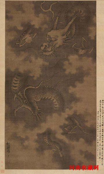 在众多佳作中,北宋松所的《神龙图》图尤为引人注目,是迄今为止国内保存最好最完整的北宋神龙图。此幅神龙图为绢本中堂,神龙腾云戏珠,此图呈典型的中轴心特点——云成S型,龙成另一S型而交*,龙头居中是为北宋典型的中轴心构图,龙爪北宋为三爪,南宋为四爪(陈容代表作即为四爪)。线条浑厚,转折有明显的立体变化,而南宋陈容的线则相对秀于北宋画。中国古书鉴定泰斗徐邦达先生定为元以上之物,业界行家一致认定为宋画无疑。