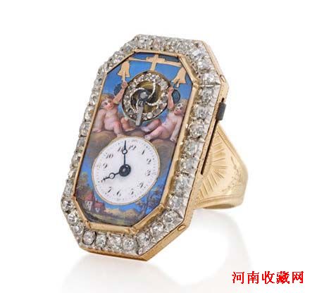 另一焦点是一枚约于1810年制、在过去文献从未被记录的活动人偶二问报时指环表,连原装盒,珍罕无比,市场难得一见(拍品编号3569,估价:港币700,000-900,000 / 美元87,500-112,500)。指环表自十六世纪面世后便一直深受欢迎,尤以装饰艺术以及微型机芯制作工艺为欣赏焦点,因为将小巧的机芯镶嵌于珠宝首饰之内,以当时技术水准而言无疑令人叹为观止。当时相信只有顶级的制表匠、珠宝工匠及珐琅工匠方能驾驭此类精密时计,而能拥有这类时计的自然是政经显贵及大富人家。时至今日,曾推出市场的复杂功能指环表有如凤毛麟角,全属独一无二的珍罕隽品,而今次的拍品则甚具代表性,因为将二问报时系统及两个活动人偶结合起来极为罕见,两个活动人偶以爱神邱比特的造型现身,手臂会轮流敲打表盘顶部的小铃以报时及报刻。其艺术价值不单只在镶钻摆轮及表圈,表盘亦有彩绘,在指环表领域而言更属难得之作。纵观上述种种,可以总括这从未有文献纪录的活动人偶二问报时指环表,实为所有已知同类指环表当中难得一见之作。