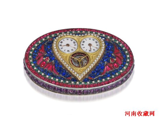 同场亮相的焦点还有一件约于1770年制、极为罕有的心形时计嵌琉璃腰带扣(拍品编号3568,估价:港币400,000-600,000 / 美元50,000-75,000)。大清乾隆(1736-1795)对嵌琉璃表、嵌琉璃饰品及时钟情有独钟,不少珍藏皆为进贡的宝物。此典范之作融合欧洲制表技术与历史悠久的广州清宫造办处琉璃工艺,更附有堪称创作之才的James Cox(1723-1791)之签名,相信是当时朝廷贡品之一。