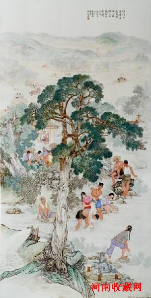 时隔三年,恰值文化大革命初期,为反映陶瓷艺术贯彻“为社会主义服务,为无产阶级政治服务”的实际行动,张松茂对《农村新貌》进行了再创造。其中表现休憩的《谁识田家乐》一幅画的场景,前景的一株松树改为苍劲的柏树;一旁正濯巾侧望的女农机手的衣饰,也由艳丽的紫衣黄裤改为黑碎花衣蓝裤;中景凉亭中休息的人数略有删减,增加了在远景收割、打场、运粮的人群;溪畔的洗濯嬉闹,中景的恬淡舒适,远景的繁忙紧张,营构出“谁识田家乐,劳逸相结合,人力胜人工,岁收定丰硕”的主题韵律。从中可以看出,画师的再创作尽管线描工谨,敷色工致,但也有在那个时代的“忐忑”之情。例如,女性的着装不敢鲜艳,即使河渚岸畔的星点野花也一律删除,柏树旁的杂树色彩也剔除了翠兰、苦绿色,显示出夏季山水绿荫葱郁的特色。此外,树型叶状的刻画也没有了旧作的装饰味,略显得“写实”,叶的上下左右及树德毗邻互衬间的疏密层次感和情景的连贯性,既有深远视觉的一致,又有主次明朗的效应。是谓“剔红删绿非本意,壮男俊女乃真情。”