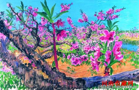 《致春天》也是周春芽本人非常满意的作品,远观此画,像泼墨,大手笔,酣畅淋漓,桃花浓艳绯红的色彩、欢畅丰饶的形态,一改中国传统桃花的温柔娴静形象。按画家所论,他画桃花充满一种矛盾和冲突的力量,是一种既温和而暴力的崭新审美经验。