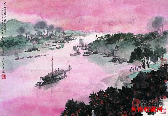 “芙蓉国里尽朝晖”(1964年作),天空、水面,相互映照着虽淡犹浓的绯红。借之於水彩画的渲染,让画面充满亮丽朝晖。墨味朱点的桔林、石绿铺染的田野、往还的水中舟楫及岸上喧腾的厂矿,绘出新时代的生机勃勃。