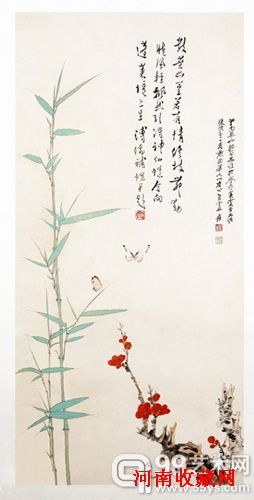 《神仙蝶侣》是张大千与溥儒的合力佳作。说到张大千与溥儒一段至真至诚的友谊,起源于1928年的秋天,张大千从上海赴北京访友,经清末诗坛第一人陈三立(散原)和著名画家于非闇介绍,在原恭王府偏福殿结识了著名文人书画家溥心畬先生。自后十年间,国内画家派则分歧,诸子亦风流云散。惟有待溥心畬自戒台寺归城中,闭关之后,出手惊人,格调高雅,俨然马夏风流。从此张大千先生与溥心畬先生常常在一起谈书论画、吟诗作赋,结下了深厚的友谊。他们的画经常一起在北平的琉璃厂展出,销路甚畅。有鉴于此,当时琉璃厂集萃山房经理周殿侯提出“南张北溥”之说,得到于非闇的响应,并在《北辰画刊》上刊登了一篇题为“南张北溥”的文章。从此,“南张北溥”之说传遍大江南北,声名日隆。 此件《神仙蝶侣》 (Lot 1098,估价人民币4,500,000-5,000,000)张大千画了不畏冰雪的红白梅与翠竹,溥心畬为之补上两只粉蝶,象征春天暖意的到来。原来这件清新而具有寓意的作品,是在1945年9月9日,日本于南京投降后所作,中国人民经过八年的抗战,终于迎来胜利的春天。两位大师在乙酉年底于颐和园相遇,对于多年来的压抑,转而为欣喜,藉由这件艺术作品来表露,对生命又再度充满希望。