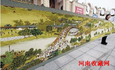 11月5日,在第七届北京国际金融博览会上,工作人员在预展十字绣手工艺品《清明上河图》。当日,第七届北京国际金融博览会进入第3天,在下午的一场拍卖会上,由6名工人耗时5年绣成的22米长的十字绣手工艺品《清明上河图》以120万元成交。