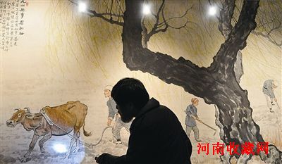 收藏爱好者打着手电鉴赏《九州无事乐耕耘》