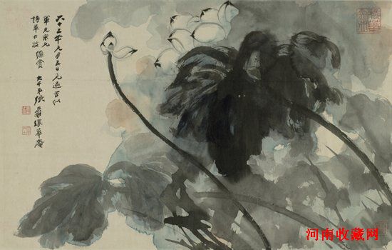 张大千 荷花 设色纸本 镜框 60.5×95cm