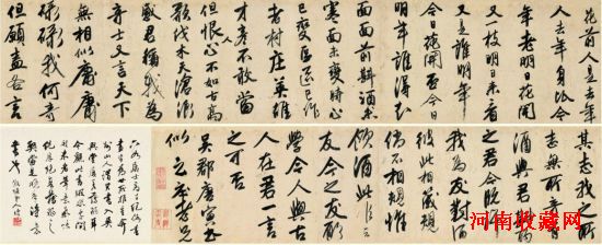 作品所书内容主要是自作的两首诗,即“花下酌酒歌”和“席上答王履吉”,两诗均见于《唐伯虎全集》卷一(附图5)。(注①)对照《全集》所录两诗,书写均不全,字句也有所出入。卷中的《花下酌酒歌》,首句“花前人是去年人”,为全诗中的第七句,且末字“人”,原诗作“身”;第三句“明日花开又一枝”,原诗是“昨日花开又谢枝”,两字有异;第四句“明日来看又是谁?”原诗“又”作“知”;第六句“今日明年谁得知?”为此诗最后一句,然原诗后面还有八句一阙,看来诗未全写。另一首《席上答王履吉》,书写首句为“面面前斟酒酒未寒”,原诗却是第七句,且所衍“面”字未点删;第五句“但恨人心不如古”,原诗为“但恨今人不如古”,其中“人”字为后补,但字句还是不对;第九句“庸庸碌碌我何奇”,属末句,之后为另一首诗,然原诗还有最后一句“有酒与君斟酌之”,此句却挪到下一首去了,可见书此诗也是节录。至于第三首诗,似乎是当场发挥、作与云庄老兄的箴规之诗,故未见《唐伯虎全集》入录。对照之下,两诗均未写全,作为节录这是可以的,但有很多字句互有出入,这又作何解释呢?其原由之一,当是背诵书写,又是自作诗,故个别字句有出入或改动,本人也无所谓,况且唐寅个性狂放不羁,自由随意,经常会写错或改动字句。另有一例可证,即上海博物馆收藏的一幅扇面(注②),书写的也是《花下酌酒歌》,虽全诗抄录,然个别字句亦有出入,如第二句中“高歌”,原诗为“山歌”;第六句中“成秋草”,原诗为“随秋草”,此扇作行楷,写得比较工整,看来其时态度比较严谨,然也出现了两处差异,可见唐寅书写自作诗是很随意的,倘是临仿之作断不会如此妄加改动。原因之二,极可能是酒后挥毫,随兴而写,因最后一首当场所作的《箴规诗》中,多处提到喝酒,如“有酒与君斟酌之,君今既许我为友,对酒彼此相箴规,倘不相规惟饮酒,”直是以酒会友。酒酣摘写自作诗,必然会有漏、重、错、改等情况,而且三首诗连缀一气,不隔行,不留空,看来酒已经过量了;从书法风貌淋漓酣畅、不计工拙、融合诸家、一气呵成等情况分析,也当是酒后之作。因此,考析书写内容,多处与原诗有出入,恰恰证明这是真迹,是与唐寅狂放的个性、酒后的状态相吻合的。