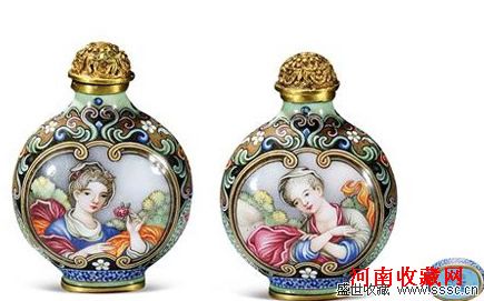 鼻烟虽是舶来品,却在中华古国开放多彩的怀抱中尽情绽放。据悉,以金属胎及珐琅为材质的鼻烟壶在中国出现的较早,且一般制造精致,多为宫廷制作。这类鼻烟壶以清 康雍乾三朝制作最为精美。并且在乾隆一朝,中外交往日盛,工艺品中画西洋的题材增多,铜胎画珐琅人物烟壶尤其如此。此壶色彩华丽,双面云纹开光西洋人物花卉图, 人物呼应自然,色彩艳丽。工匠绘制时注意了人物衣着褶皱的处理,细腻、流畅,华贵而柔美。据了解,这一款鼻烟壶原为伦敦古董商Robert Hall的旧藏。