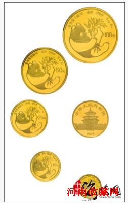 1982年,中国人民银行决定采用中国的国宝大熊猫作为普制币的主要图案,我国第一套熊猫金币由此产生。此后,每年都会发行,当然设计、枚数和发行量等方面不尽相同。而1984年发行的熊猫金币,有1盎司、1/2盎司、1/4盎司、1/10盎司、1/20盎司,共计5枚,共同正面为北京天坛祈年殿,背面图则为熊猫食竹图。