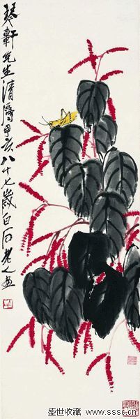 齐白石可以说是一位富有传奇性的艺术家。他出生木工,早年在家乡学画“行像”补贴收入。年至花甲,定居北京,经衰年变法而成就独特艺术事业。老人山水、人物、花鸟皆擅。其山水作品造境新奇,用笔直率;人物画作洗练简约,充满诙谐童趣;但大量的花鸟创作才正是其集大成的类目。齐白石长期的农村生活经验和文人化的艺术追求,使其独具敏锐的观察力和高超的艺术加工水平,信手拈来的写意小品往往出落自然又意蕴深厚。其花鸟作品中单纯的感染力既具有美术史价值,同时也颇受人民喜爱。《螽斯红蓼图》是齐白石盛期佳作,其中笔墨形色已足够玩味,一方“鬼神使之非人工”的钤印更为我们了解齐白石的艺术世界的一个新提示。