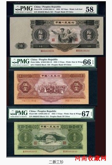 第二套人民币是新中国成立后第一套具有完整货币体系的人民币,首次实行主辅币制。该套纸币共有11种不同的面值,19种不同的版别,只流通了10年的时间,存世量很少,近年来价格也是一路攀升。民族大团结红5元,现在的市场价位在五万元左右;我国纸币发行史上唯一的3元面值纸钞,当前价值约为十万元;加长版的10元人民币,更是由于造型独特和数量稀少,目前三十万元也很是一钞难求! 因券面印刷精美,回收彻底;加之是苏联代印,历史感厚重。这三枚券被藏家誉为“二版三珍”。