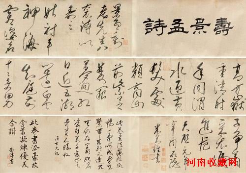 中翰清花2011“清花岁月”跨年拍卖会之《寿景孟诗行草》与苏州博物馆所藏《刘景孟八十寿诗》同为景孟贺寿所书,长331厘米,高25厘米,约7.4平尺。迎首有清末重臣端方 “寿景孟诗”四字隶书 。画心为贺寿诗句,用笔劲健丰润,提按分明, 线条的组织与衔接极敏感,惯于一笔数字,贯气流畅,中途无怯滞生硬之感。点线盘曲纡环, 体势沉着秀逸, 多欹侧跌宕之姿,确有米字气派。