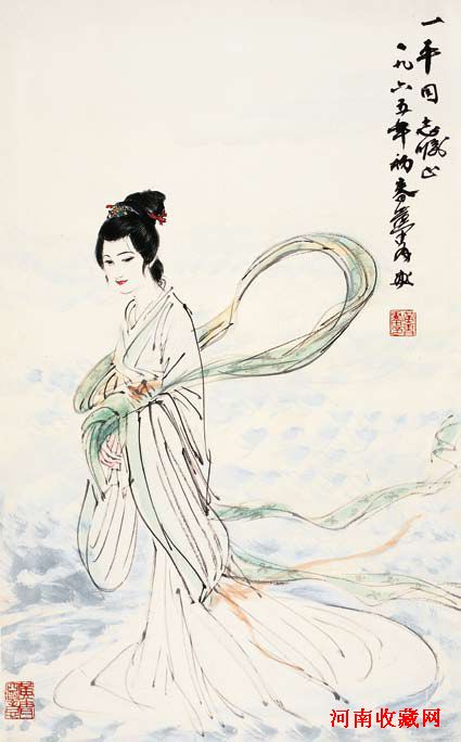 王一平是在60年代初,經由在北京工作的同鄉,學友加戰友,又同為藏友的谷牧介紹結識了黃胄(谷牧極為欣賞黃胄的才華,曾把自己收藏的100幅現代畫家創作的“梅花圖”,著名的“百梅圖”捐獻給由黃胄創辦的“炎黃藝術館”,其中十多幅海派的梅花圖是由王一平在上海代為收集的)。與和自己年齡相仿的海派書畫家的交往相比,王一平與比他小十幾歲,同在部隊工作過的黃胄交往除了互相敬重外,更多了一份隨意和率真。王一平每次到北京開會,都會去黃胄的寓所,談論書畫,觀看作畫。97年4月,王一平從谷牧電話獲知黃胄病逝的消息後十分悲痛,他讓兒子取下客廳掛有朱屺瞻的水墨畫的大鏡框,從朱的畫後面取出一幅畫放在前邊掛出。這是一幅家人從未見過的淡彩仕女畫,作畫時間竟是1965年,難道這幅畫壓在畫框後已30年?面對家人的疑問,王一平講述了黃胄創作這幅“洛神圖”的經過。