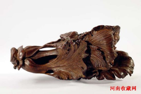 而此次西泠竹雕專場中的這件竹雕白菜擺件可以說是近些年來在拍賣市場及竹雕收藏圈中所見最為精彩的作品。白菜圓雕而成,整體形態略有彎曲。數片菜葉皆飄逸勁挺、內外通連。不僅外部姿態肖妙、生動, 內部轉折、凹凸亦是一絲不苟。菜葉葉脈絲絲分明、變化有度。葉片的邊緣卷褶自然,數處蟲蝕的空洞也惟妙惟肖。菜頂部的處理非常困難,材料總是有限,如何讓一個平坦的截面顯得自然而然、毫無拘謹是頗有難度的。作者將此處展現為半張未張的包卷葉面。巧思與妙手使得有限的材料發揮出無限的美感。它所展現出的紋路、轉折、起伏、以及竹材本身的纖維質感是如此巧妙地融合在一起。置於掌中端視,菜葉上端竹纖維所顯出白菜綠葉部分那種凹凸不平的質感,只得借助於手中摩挲的觸覺、在愛不釋手的把玩中才能品得真味。