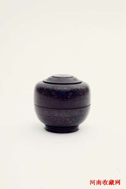 古玩之中品類繁多,物無大小貴在能精。一件紫檀嵌金銀絲的小盒子,便小中見大,頗有玩趣。小盒如青銅器敦的造型而略其高足,承以簡潔的圈足,上下兩部分,子母口。通體以金銀絲鑲嵌,上下口沿處以雲雷紋裝飾一周,以分開上下兩部分。之間金銀相間隔嵌出變體獸面紋。紫檀沈著的底藴加以金銀閃耀頗有別趣。
