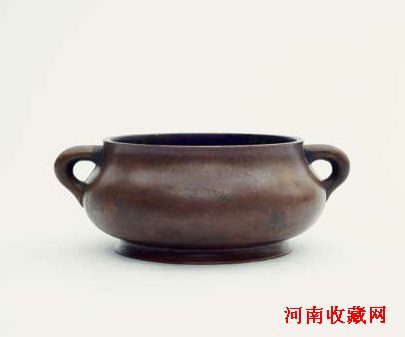 一隻大明嘉靖年製款的簋式爐,楷書六字款,銅質精煉,束肩秀美。無雙耳的造型更顯素雅端莊,文房案頭可增清趣。