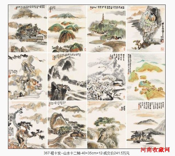245号拍品,张大千的蕉竹图,数人几乎同时举牌,最终成交价46.5万元;302号拍品,三吴一冯合作四君子图,各竞风流,以56.7万元成交。358号拍品程十发的《东风吹着便成春》,为程氏样初成时的写生佳作,其风貌实为罕见,最终以94万元成交。另一组程十发晚年佳构,山水小景十二帧,题材丰富,含春夏秋冬四景,水墨与青绿兼具,各具风貌,可以说是程氏山水的总结,最终以241.5万元,成为本场拍卖的魁首,现场亦响起了热烈的掌声。