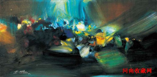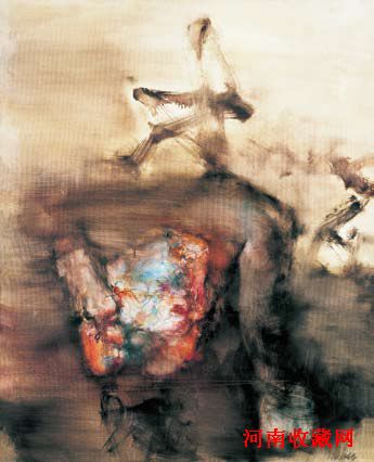 2、朱德群的《永恆》秉承了其鮮明的抽象畫風,橫構圖展開的是一個東方人特有的精神世界,那被風旋錐於夢幻之島的是一顆色彩詩人的靈魂,畫作所傳遞的迅疾的印象令人如此著迷。