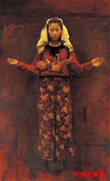 著名油畫家郭潤文創作于1996年的作品《玩偶》,是其一生的成名之作,作品有近十次出版及重要展覽。作為一名一流的寫實主義油畫家,郭潤文在這張畫中所流露的夢幻的詩意,表露了這個四十而不惑的中年男人所特有的“思”,一個垂目端臂的少女的莊嚴神聖和一個懸浮於前的嬰兒,似乎在暗喻少女脫胎於母體的本能的母愛,紅色的背景讓人想到女性的成長與某種來自於其體內血熱的關係。少女內心的不安與羞怯,對母愛的渴望,在一種故作鎮定的克制的神態中,反而更顯突出。郭潤文如此敏銳地表達,說明畫家對異性的關切是與女性的成長經歷緊密聯繫在一起的,想必女性讀者對此的感觸會更為豐富。