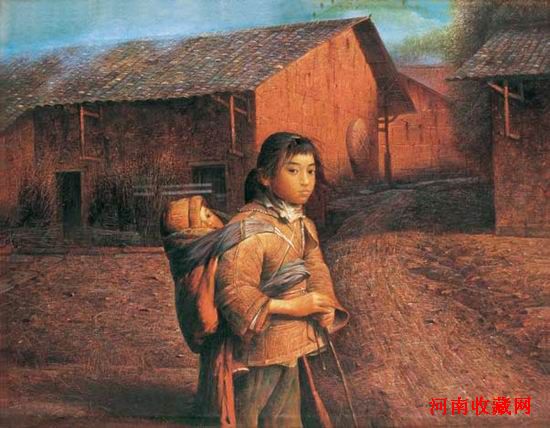 《夕陽炊煙》創作于1991年,出版於《純樸的世界——羅中立油畫作品集》。羅中立對人生的摯愛深深植根於川蜀大地,老農、壯夫、女孩兒,黃昏燈下的熱切相擁,背著弟妹的小姑娘回眸在漸遠的土路上,任何一個片段都可以產生長久的感動。