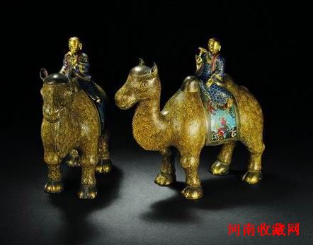 掐絲琺瑯工藝品是明清以來頗受宮廷青睞的藝術品種。複雜的製作工藝和精美的藝術氣息一直也受到今日藏家的追捧。寶古山房所藏銅胎掐絲琺瑯胡人騎駱駝對尊,造型別致,人物修飾細膩,短髪,身著胡服。座騎駱駝塑造生動,將動物寫實的表現出來。整器做工精良,釉色純正,是清代掐絲琺瑯的精品之作。