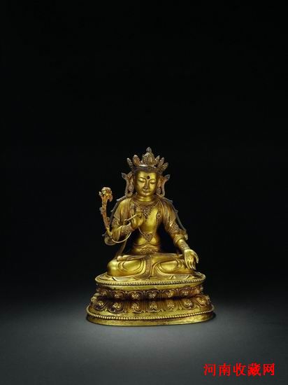 另一尊銅鎏金自在觀音像,則帶有明顯的中原氣息,該尊銅鎏金自在觀音頭戴幅巾,冠頂有無量壽佛,開相慈藹。胸飾瓔珞寶珠,手戴臂釧。衣紋邊沿細刻纏枝花卉紋。菩薩呈遊戲坐於蓮臺之上。此尊觀音坐像神態莊肅,法身優美,如凝望之,可感掙脫苦悶,化繁為簡,怡神靜心之境,乃小件大氣之作。