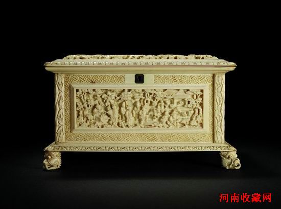 另一件象牙雕首飾盒,則以工藝精湛見長。該盒呈長方形,凸面束腰,盒蓋圈飾如意雲紋。蓋面滿刻花紋,人物足有二十餘位之多,將楊門女將叱吒沙場之雄壯場景展現的淋漓精緻。盒壁四周作萬字紋飾錦地,中心開光內以庭院屋舍為景,刻繪孩童嬉戲,瑞獸飛禽等場景。底面四足承龍首。整器運用減地法雕刻,構圖佈局合理,繁複華麗,極具收藏價值。