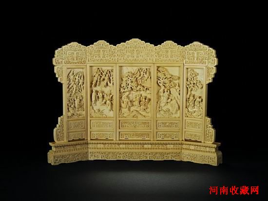用料之大當屬象牙雕人物五聯屏風,此屏風用料碩大,冠飾為減地陽紋纏枝花卉及簡化夔紋。其下五條屏風主體皆以減地高浮雕製奇石亭台,松柳花草,人物神態豐滿。底座雕成蓮花束腰須彌座形,並飾簡化夔紋,與冠飾相呼應。屏風整體氣勢磅礴,細節處一絲不茍。