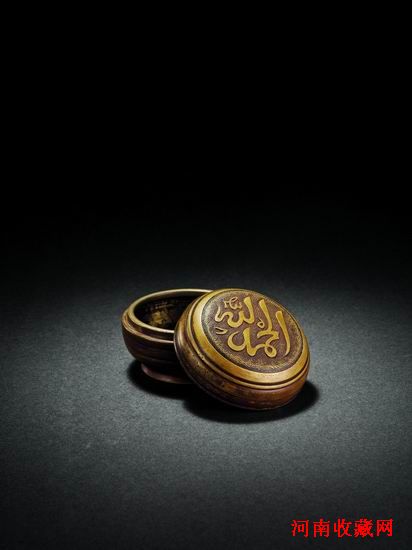 爐具從來都是文房書案不可或缺的陳設擺件,與之相伴的香盒亦為重要,本場爐具中就有一件清早期阿拉伯文銅香盒。此件香盒,形制圓鼓,蓋面圓拱,以珍珠錦地紋作底,中央開光之處以淺浮雕阿拉伯文可蘭經句,極富裝飾效果。整件器物胎體厚實,通身皮色黃潤,寶光內斂。