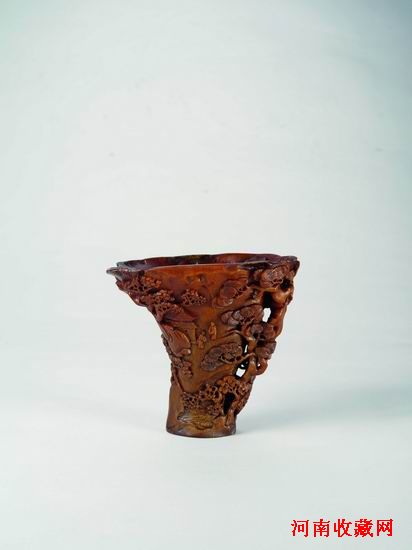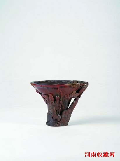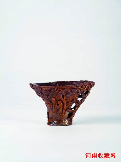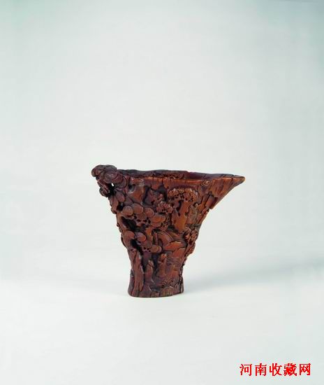 清早期·犀角雕山水人物杯,採取浮雕、圓雕、鏤雕等多種技法,刻畫一幅圓轉立體的山水閒居圖畫,畫面飽滿,層次清晰。杯身琢刻以浮雕為主,大刀闊斧,表現出層層疊疊的山石林立。其間水面波瀾起伏,河畔蒼松挺立,漁舟泛於湖中。案上亭台樓閣隱現其中,兩人相對而立,當時友人相間拜會。結合犀角本身具有的自然天溝地崗,巧妙地鏤雕出一株古松作為杯柄,又用地崗凸起的部位浮雕松樹之枝葉,松葉平展如輪,直入杯內。整杯皮色處理深沉厚重,猶若蜜蠟,山水人物精微細膩,極富表現力。