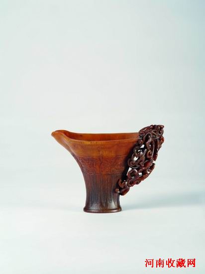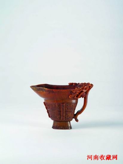 明·犀角雕高浮雕螭龍杯,口沿平面近方,前端曲折翻轉,形成流口。杯內光滑,折腹內凹。杯身外圓曲而下,足部起線,高圈足。腹身以淺浮雕刻一螭虎紋帶,螭龍相佈緊密,身上帶有兩翼。螭龍下有一條條蕉葉紋,長短不一,錯落有致。其杯柄為整器的亮點,採以鏤空技法圓雕五條螭龍相互盤結一起,其中大龍攀附杯口,頭部內探,其餘四隻遊走依貼其身,形成的線條穿插遊走,極為精美。