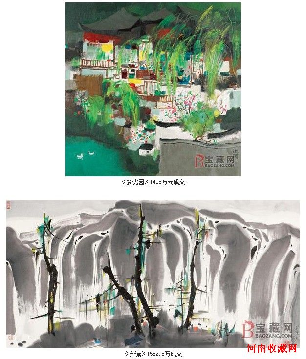 杭州国立艺专在林风眠校长的带领下,培养了众多当今绘画的主流人物,他们学有所成而艺术追求各不相同。与杭州国立艺专颇有渊源的艺术家,吴冠中先生的两幅作品,也颇受藏家的青睐。油画《梦沈园》是吴冠中先生游访绍兴园林沈园之后,并结合陆游诗词凭想象创作的一幅佳作,其典故广为流传,且该作品有众多出版物和展览记录。在预展时就得到藏家的热烈关注,最终众望所归,以1495万元被藏家喜获。另一幅创作于1988年的彩墨《奔流》,也是吴冠中的重要代表作品,是同题材中的上乘之作,最终以1552.5万元成交,为本场第一高价作品。