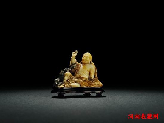 像這件清·壽山石巧雕降龍羅漢,絕算不上什麽奇珍異寶,但靜心品觀便會發現這件作品是如何的不易。所用為非常普通且雜色漫布的壽山石,即便作印材也不上檔次。但它的作者卻讓一個生動的羅漢呼之而出。羅漢身體為乳白色,圓目,腦後數屢捲髮披於肩頭。雜色部份處理為衣紋,其上淺刻祥雲。露出半臂、前胸,顯出羅漢解衣般礴之態。下半部露出膝蓋及一足,與衣紋的互現自然而曼妙。黑色部份原本是難於處理的雜色,在巧匠手中卻變出一條生動的黑龍,羅漢右手一點黑色便成龍珠,似是天成。一位巧匠能讓這原本普普通通的材料變成活靈活現的玩物,衣服、身體、黑龍各個部份又是那麼巧妙自然,不得不牽引著觀者從更多的工藝或藝術的角度來審視今日繽紛的古玩何者為珍。