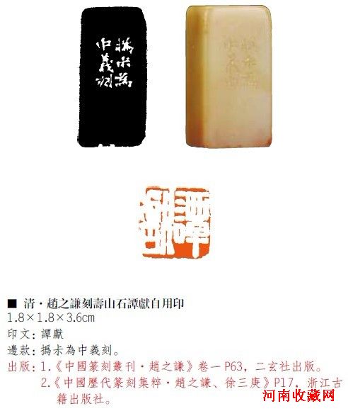 趙之謙(1829-1884),為晚清傑出藝術家,在碑刻考證、詩文、繪畫、書法、篆刻等方面,都有獨特風格和很高的成就。篆刻取材廣泛,意境清新,自成一家面目。趙之謙印,向來稀少,所存均傳世精品。本屆拍品白文印“譚獻”,用刀簡樸厚實,融合漢鑄印及皖浙兩派之長,大疏大密,大開大合,有“疏可走馬,密不容針”之妙。譚獻原名廷獻,字仲修,號復,同治舉人。歷任安徽歙縣、合肥等地知縣。為章太炎之師。譚氏曾為吳昌碩䂭文集印稿題寫序文。而所鈐之印即本屆拍品,此印之珍貴由此可見矣。