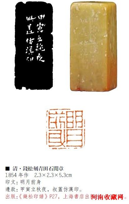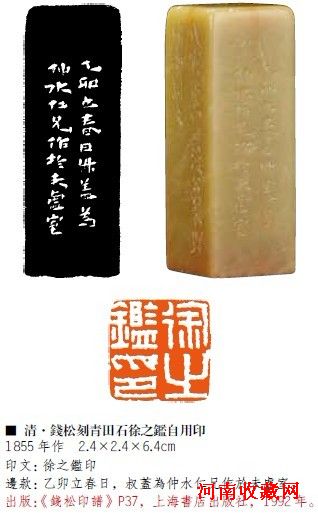錢松(1818-1860),工書善畫,好金石文字。曾臨摹漢印二千鈕,功力極深。其刀法最有創新,切中帶削,極富立體感。本屆拍品,白文“徐之鑒印”爽利穩健,元氣充足。朱文印即“垕盦”,披削淺刻,渾穆從容,韻味無窮。朱文印“明月前身”為錢松37歲時所刻,四字直橫之筆,動靜變化巧妙,故無平板雷同之憾。此印吳隱為丁輔之得於滬上,頗為珍愛。