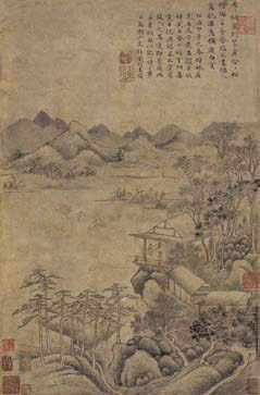 文徵明(1470 ~ 1559) 虎丘圖 設色絹本 鏡片 1554 年作 26.5×96cm 說明: 畢沅、畢瀧舊藏。