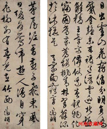 在這場明末清初書法的嬗變之中,王鐸是繼張瑞圖之後最為核心的人物。與張瑞圖不同的是,王鐸一生中的任何時期都有其標明臨帖的書作流傳下來,《草書 臨張芝冠軍帖》即是其中年時期的臨帖作品。雖是臨帖,實際上卻把帖中不足掌心大小的字放成幾倍的尺寸,然後置於整條的綾緞之間;不加思索的急速運筆,說明了可能只是背臨帖字在腦中的印象。不過,因此而產生的巨大的、連綿不斷的結體,卻恰好與晉人狂放不拘的性情相符。王鐸在政治上曾作二臣,故而常常被後人指責,但是政治上的境遇並不能完全指明書寫的風格,王鐸反而在仕清以後保持著一種看上去剛正不阿、極具骨架的行草風格。然而,書寫此軸時的心情卻又不可不提:該年九月(崇禎十三年,即1640年),王鐸被授予南京禮部尚書的職位,登上其政治生涯的最高峰,而與此同時,李自成與張獻忠分別攻陷隕均、劍州,大明王朝已是處在四面楚歌的境地之中。一個月後,王鐸與家人取路暫返家鄉孟津,先行的家人卻在途中被數千農民起義軍包圍,王鐸立即率領二十五人騎兵突救,竟然成功救出家人,並雙雙突出重圍。可是年邁的長輩畢竟禁不起這樣的折騰,父親在不久後便撒手人寰,母親也於數月以後病故。此軸即作於崇禎十三年的冬夜,夾於父親與母親亡故的時日之間。寒冬臘月的時節,不得不提心弔膽地帶著家眷露宿他鄉,國家的命運尚且生死未卜,自己即便做得高官,又是如何。