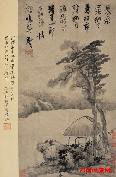 龔賢常常被冠以清代金陵八家之首的名號,實際上,他的活動年份比八大山人還要稍早。在明末的時候,龔賢與復社、東林黨人等人頗有往來,到了明亡之時已是接近而立之年,卻不得不因為國破家亡的原因漂泊在外,最終在康熙五年(1666年)結廬於南京清涼山下,從此開始過著悉心畫藝的隱居生活。在早年時,龔賢受周圍文人圈的影響,取用楊文聰等人的筆法,但是已經流露出極為個性的冷逸趣味。成熟以後,則可能與早先同在南京的畫家吳彬有著異曲同工的努力——靠近一種極為渾厚宏偉的壯麗風格,以形成後來金陵畫派所獨有的面貌。《松陰琴韻圖》正是表明瞭這種典型的渾厚風格與傳統明末文人意趣之間的淵源。在不大的尺幅當中,雖然沒有雄偉巨製所需要的層層山巒,卻依舊用此種筆法繪就了一幅明亡文人十分熟悉的生活場景。況且,這種筆法並非是人們意想地那樣簡單排列,而是極為細膩、鬆動,又變化多端的。松樹上的葉子從最潤的部分,到兩層淡墨疊加的部分,再到稍乾的筆觸,最後是濃墨,互相之間都組織得有條不紊,同時不斷考慮到整體的佈局經營,以至於在畫完亭頂的部分之後,為了與周圍的景物更為協調,立刻添了幾下並不讓人察覺的筆觸。龔賢的這種超凡功力,恐怕也是他的風格在後世無法效仿的原因之一。當然,在習慣了文徵明、董其昌一路的鑒藏家眼中,龔的畫作確實很難歸入他們的風格體系,所以在面對如此頗具文人意味的龔賢畫作時,吳湖帆依舊在裱邊稱其“筆墨殊厚”,這倒也是不足為奇的。吳湖帆收得此作之後,可能又悉心裝裱,並將之送予他的表親,同樣作為文人墨客的彭恭甫。吳、彭二人於1924年來到上海,彭恭甫是吳湖帆書畫事務所的得力助手,吳湖帆在跋中所用的書風,也說明了是到上海不久的數年中所題。