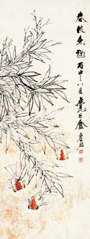 《三千年結實之桃》乃吳昌碩繪於1906年,取其桃樹、巨石祝壽之意。畫中凌空繪桃一株,數枚碩大嫩桃掛於梢間,枝幹穿插生動多姿,翠葉鉤筋如草書飛揚,巨石玲瓏如篆筆蒼潤,色彩豐富濃鬱華滋,不僅令人想起缶翁常題在桃樹邊的詩句:“灼灼桃之花,赬顏如中酒,一開三千年,結實大於斗。”若從此作觀之,其時吳的筆墨已趨成熟,風貌自成體格,章法構圖的大開合與大斜角法亦已形成,題字也與畫面相得益彰而成為有機整體。吳昌碩終在趙之謙、任伯年等前人的基礎上,以書入畫、以印入畫、以金石氣入畫,將寫意花鳥畫推到了登峰造極的地步,由此開創了融詩、書、畫、印為一爐的海派文人畫風新境界。