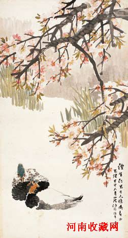 如果沒有在1877年認識高邕之,任氏兼工帶寫的風格或許還將持續得更久些。然而正是虛谷的這另一位忘年小友,將任伯年引入了八大山人的畫境,從而令其領會到“懸腕中鋒”之道,後又從新羅山人處悟得用筆用墨當“如公孫氏舞劍器,渾脫淋漓頓挫”之妙理;終得筆法大進,以前剛勁有餘而含蓄不足的釘頭描漸次收斂,慢慢過渡到遊絲描,筆勢漸趨奔逸,脫離了任熊、任薰的筆墨而飛躍到一個新的階段。《春江水暖圖》作於1884年,正是任伯年思想最為活躍,藝術上甄於爐火純青的年代。這一年,他摹寫了更多的青藤白陽筆意,勾勒與點染、墨筆與沒骨相結合的小寫意作品已達盡善盡美。在此幅畫中,數枝斜偃的桃花自右上方向下傾出,樹枝以極富行草書意的筆法一氣呵成,破墨點拓的樹瘤疤構,沒骨黃綠的枝端新葉,飽含水分的粉色桃花,清新淡雅,嬌嫩妍豔;淡墨塗寫的背景中尚存幾分早春寒意,而疏疏的蘆草已泛出嫩黃綠意;畫面下方大片留白之中,一對鴛鴦浮游波上、顧盼水際,好不悠閒;雖未曾題詩,卻儼然是一幅“春江水暖鴨先知”、“只羨鴛鴦不羨仙”的詩意畫面。