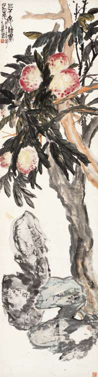 吳昌碩(1844 ~ 1927) 三千年結實之桃 設色紙本 立軸 181×47.5cm