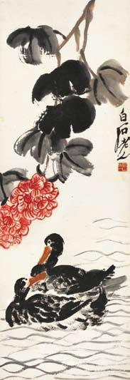 齊白石(1863 ~ 1957) 雙鴨戲水圖 設色紙本 立軸 101×34.5cm