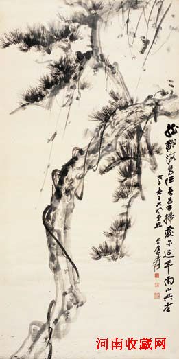 雖然有“南張北齊”,或“南張北溥”之譽,然而張大千更多的是往返於京、滬、川三地、流連於名川古跡間。在他中青年時代,幾乎從未涉獵西畫,也從未糾纏於傳統派與革新派的論爭之中,一心在傳統繪畫的領域中臨習探索,山水、花鳥、人物無所不能。石濤的山水筆法對於張大千早期的山水表現方法影響甚巨。他幾乎是在摹習、擬仿石濤畫中逐漸確立了自己的皴法及筆墨風格,甚至其晚年發展到了潑彩畫階段,也還隱含着石濤的畫理於其中。在這幅張大千1948年作的《勁松圖》中,其運筆恣意、揮灑自如、不羈成法,講究全域的豪放鬱勃氣勢,與石濤的風格不無關係。然而在表現松枝與古藤的迂回盤繞的形態上,他讓流動的筆墨在畫面上的快速遊走,橫掃點拓間,筆勢起伏森然,更突出表現了古松盤撥勁健的精神氣貌。