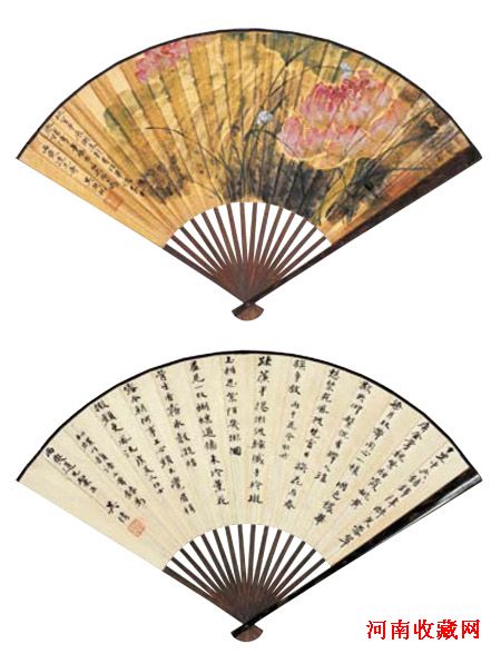 吳湖帆的妻子潘靜淑亦是名門才女,夫妻之間,詩畫唱酬,極是相得。約在1936年夏季,夫妻二人相對盆荷之時,偶發畫興,當即縱筆賦色,由此自創荷花新格,被世人稱為“吳裝荷花”。其所新創的荷花畫法,實際上是將大寫意的筆法與惲壽平式的沒骨設色相融合,以淡墨加青綠畫荷葉,襯托出花瓣重疊、色彩絢麗的千面蓮,豔而不俗。吳湖帆對能在古法之外的這一“標格出新”頗為自得,常常將“吳裝荷花”扇面贈予友人。此《荷蝶圖·書法》即是其贈予好友黃西爽的祝壽之禮。黃西爽乃海上名聞一時的中醫泰斗,因喜書畫,與海上諸多畫家如吳湖帆、沈尹默、謝稚柳、陸儼少、吳青霞等素有往來。吳湖帆更是與其交誼深厚,故而此作格外用心別致。其“荷蝶”一面,依舊是簡筆荷葉與重瓣重彩的荷花,水氣淋漓的墨筆與賦色,在泥金設色的扇面上,更加的燦爛異常;近景處獨填幾筆幽蘭,兩隻白色蝴蝶舞動其間,真是道不盡的蝴蝶鴛鴦派之情懷。而其後 “書法”一面,果真和上二闕婉約派詩詞,均出自當年與蘇青、張愛玲、潘柳黛等齊名的閨秀周鍊霞的螺川韻語。不僅令人回想昔日,吳湖帆髮妻靜淑猶在時,那一派琴瑟和鳴、綠遍池塘草的光景。
