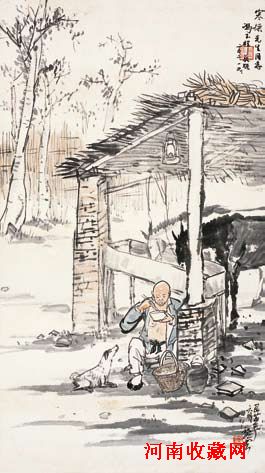 長安畫派正是在20世紀50、60年代崛起的新畫派。它強調寫生,但不同於徐悲鴻的寫實主義;它傾力於傳統,但走得又不是純文人畫的路子。這或許與其開創人趙望雲、石魯的大眾化、民間化的繪畫審美觀念和追求有關。30年代初,趙望雲開創 旅行寫生,以中國畫形式反映社會現實生活。他在天津《大公報》發表的農村寫生通訊連載,名震一時。這些畫反映了中國的真實面貌和苦難生活,和中國人民的命運息息相關,不僅贏得了讀者的歡迎,亦受到“布衣將軍”馮玉祥的賞識,二人遂成摯友。當他將連載的130幅寫生畫,集結出版《趙望雲農村寫生集》時,馮玉祥不僅親自為其作序,甚至花費一個月時間為每幅畫配上了白話題詩。 此後,兩人更是常以詩配畫的形式合作,或發表於報章、或鐫刻於碑石,寄託憂國憂民之情。這幅作於1935年的《農家小景》,筆調樸素、形式通俗,一如他的“農村寫生”充滿了泥土的氣息。其中既有對民間苦難的無限同情,也有對農家苦中作樂的欣慰,勤勞的讚頌,與命運頑強搏鬥的生命力的肯定。馮玉祥將軍以此畫贈予梁寒操,或許也可以看作是希望同袍戰友“到民間去”的呼籲。