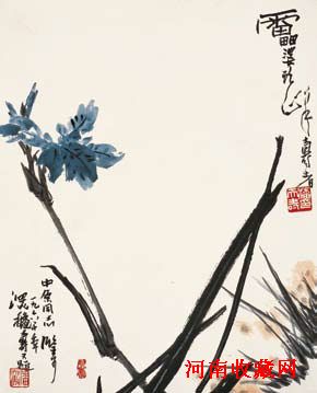 其《山花圖》和《清韻圖》表現的不過是山花與荷花之類的平凡小景,卻亦是風骨錚錚,具有力的美感。這或是與他的用筆用線有關。其作畫多以隸和魏碑入畫,線條方折生挺,構圖奇峭險絕,這在其畫中幾乎成為了一種人格化的張力。我們看《山花圖》,花枝與葉在畫面中軸線上形成對稱“V”字形;右邊的枝葉向上伸展,直沖“雷婆頭峰壽者”的行草直題,“雷”字又扁又大,似欲與左邊低垂的藍色山花兩兩相望;而左下的題款又與右下角的水仙形成平衡;整幅構圖,上空下滿,穩中求奇。正是“畫得不多,空得很多。畫內不多,畫外很多。”