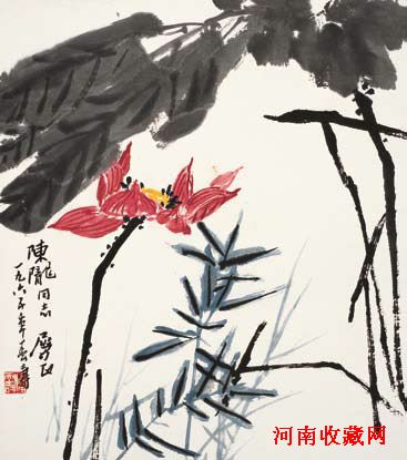 陳隴同志上款的《清韻圖》則是取芭蕉、竹葉、荷花幾種與君子為樂的植物:芭蕉用大筆潑墨,從左到右,覆蓋其上;下接盛開紅荷,紅濃線勾形、淡紅色染花瓣,濃墨枯筆的花枝撐於畫面左右;若干濃墨勾筋、摻以花青的沒骨淡竹穿插其間;全圖以墨接氣,以色醒目,雖着色不多,卻清新古厚, 耐人尋味。陳隴曾與潘天壽共事過,或許沾染了林風眠開創的相容並蓄的氣息,其收藏中甚至有一些頗具現代性的作品,此次上拍的除了這幅《清韻圖》,還有關良的戲曲人物畫《貴妃醉酒》。