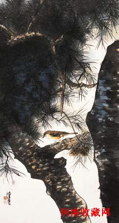 陳佩秋的花鳥畫,越臻至晚年,其藝術個性益發鮮明。尤其是其松禽圖,往往追求一種蒼莽幽朦之境,《虯松棲禽圖》所抒寫的即是如此意象。在松的用筆中,她將蒼禿而毛澀的枯筆渴墨與流暢而飄逸的細勾密皴揉合一體,飄逸中透出沉着;綿密松針下是層層的花青色渲染,用墨和用色互為融滲,渲染、潑彩和積色整合揉雜,光色變化中富有空間的進深感和生命的彌漫感;而在參天虯幹與繁枝密葉間預留出一塊空白之地,仿佛月夜傾泄下的銀色,其間綴上一隻工趣有致的金色小鳥,作為畫面的視覺中心,猶如精靈般,頗具生命象徵和啟示的意味。