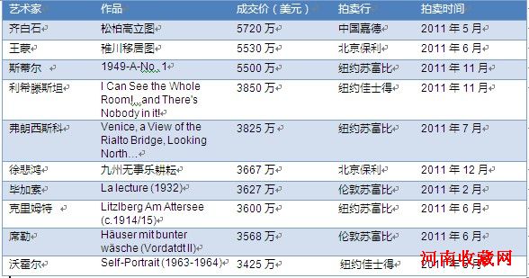 Artprice每两周会对世界范围内的艺术品做盘点,2011年是全球艺术品市场最好的一年,本次盘点的是2011年全球最贵艺术品TOP10,中国有三位艺术家上榜,分别是齐白石、王蒙、徐悲鸿。